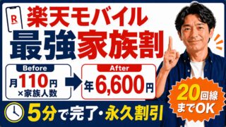 スマホ・回線 楽天モバイル最強家族割のやり方・いくら安くなる?【5人家族で年6,600円節約】 楽天モバイル「最強家族割」で1回線あたり月110円引き。5人家族で年6,600円節約。対象プラン・申込方法(5分)・よくある疑問まで、地方在住40代5人家族が実体験で解説します。 2026.04.23 スマホ・回線
