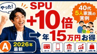 固定費カットまとめ 楽天SPU+10倍で年15万円お得|40代5人家族の2026年攻略法 楽天SPUを+9倍まで上げて年間15万円お得にした全手順を公開。元スーパーバイヤー40代5人家族が、2026年最新のSPU一覧・優先度ランキング・計算根拠を解説。初心者でも確実にポイント倍率UP。 2026.04.24 固定費カットまとめ楽天経済圏